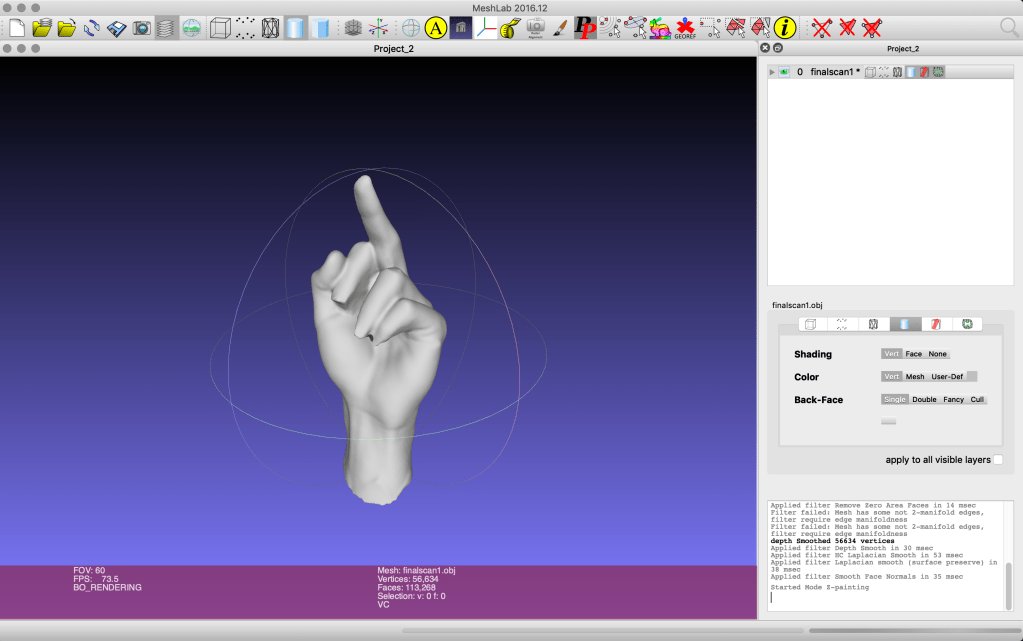 I then applied a bunch of tools & hole fixers to actually get it to look like a hand. I also saved a bunch in between each of these edits as I still didn’t know why the other practice scan I did wouldn’t load in Processing and wanted to have every version available if I needed it.