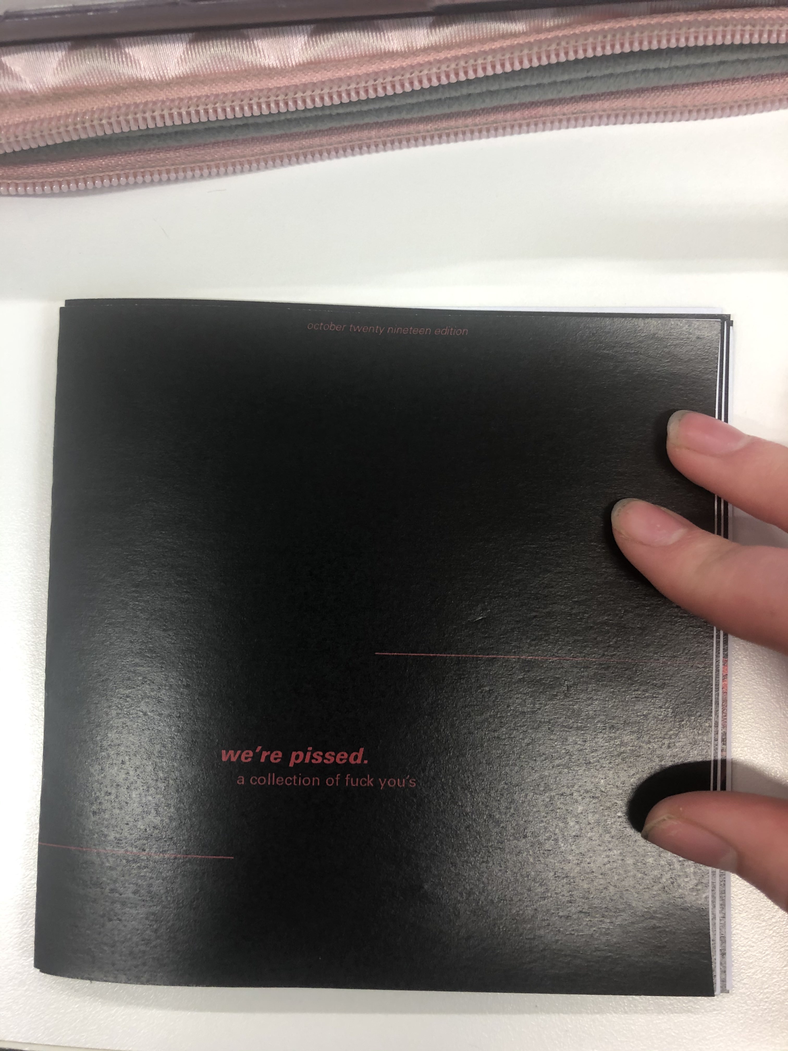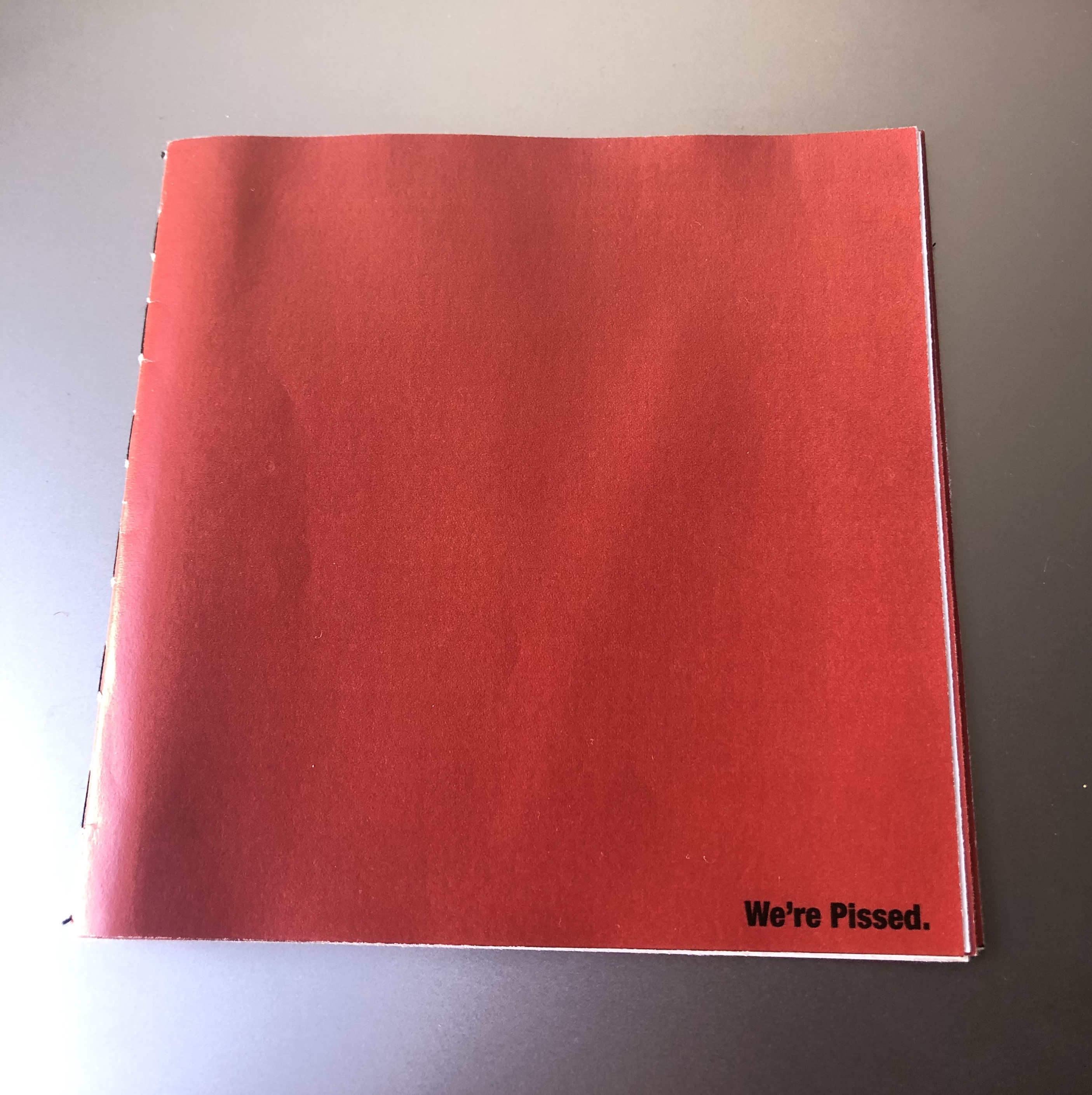 The simple ‘We’re Pissed’ on the front cover of my mockup seemed to do well as people wanted to know what ‘we’ were pissed about and why it was written/designed in such a way that was more matter-of-fact than forcing this anger down their throats.