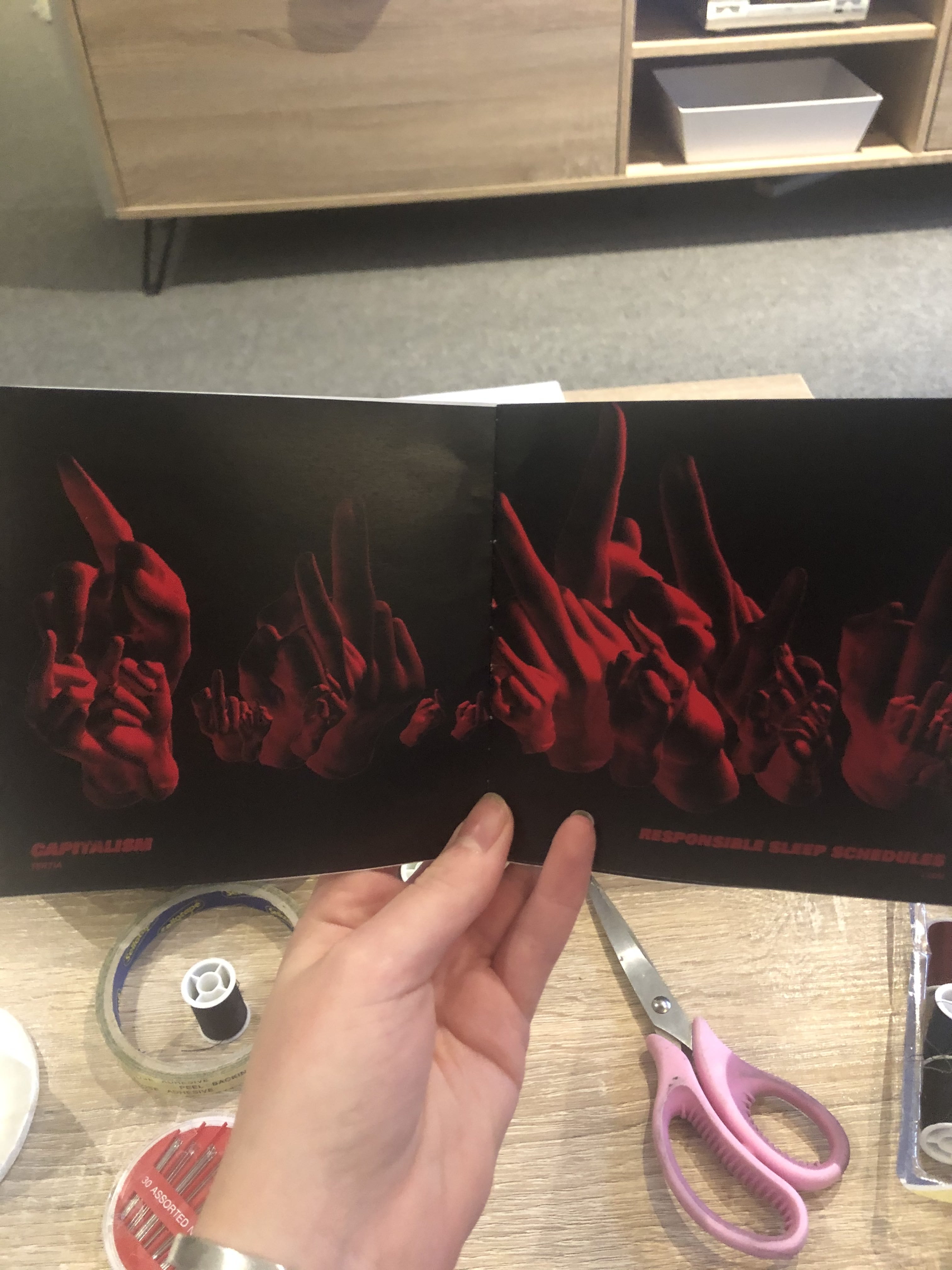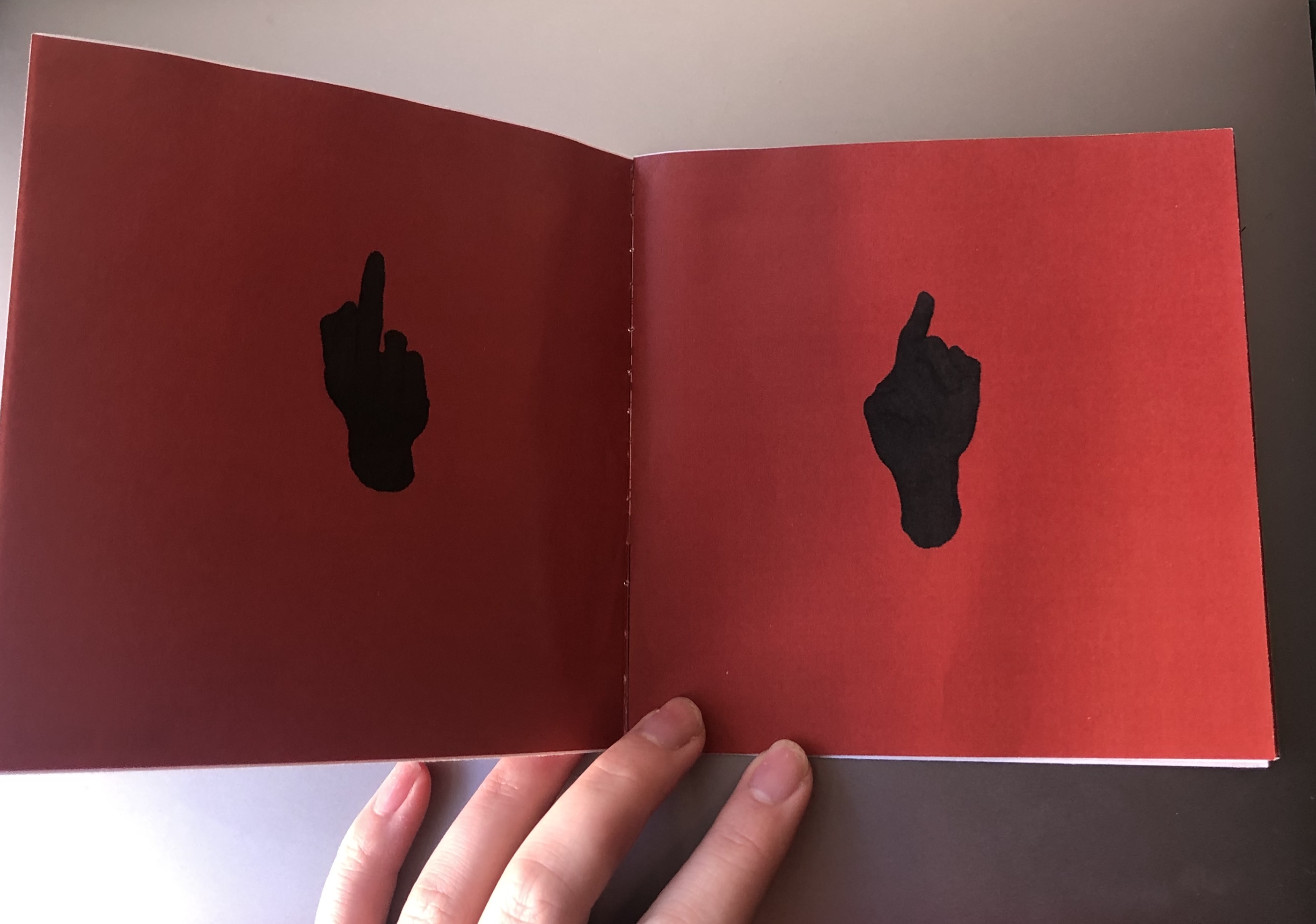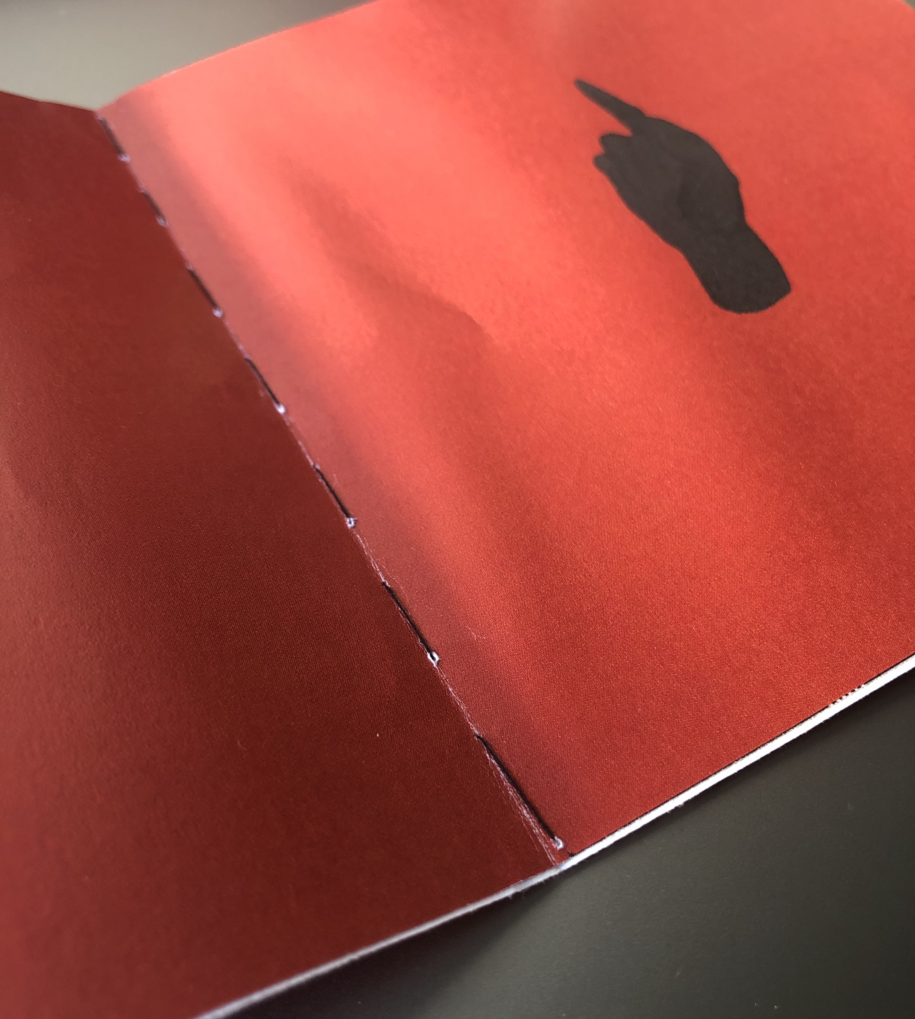 In the end I simply took screenshots of my output and created a booklet out of that, the quality isn’t great and the printer lost some of the definition of the hand, perhaps in print I need to lighten the fill colour of the hand. One positive thing is that I practiced stitch binding on the booklet and it was quick & easy and looks good.